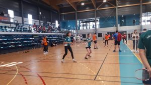 Après avoir attendu que les autres poules finissent leurs matches, nous jouons notre 1/4 de finale contre Pau. Nous faisons quelques ajustements chez les filles. Le match est très serré, les équipes se repassent devant à chaque relais. Nos élèves résistent bien, Mathis et Hugo font une belle remontée, Pauline et Coline résistent bien et Jérémy et Pauline achèvent le match sur un beau 50 à 48.