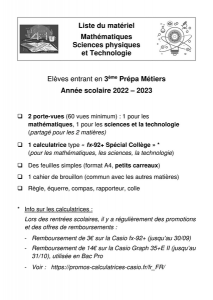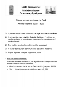 Les modèles demandés sont la Casio fx-92+ spéciale collège (en 3ème et CAP) et la Casio Graph 35+E II (en Bac Pro) ; avec les offres commerciales, la Graph 35, utilisable jusqu’au BTS, est moins chère que la Graph 25 !