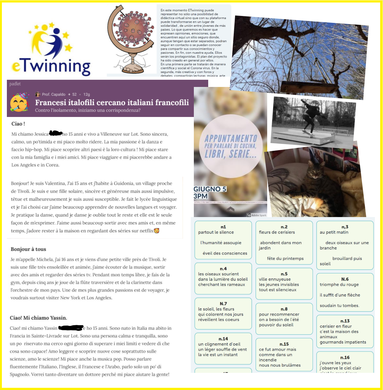 Avec la collaboration de Mme Jacqueline Fassero, professeur responsable des lycéens italiens apprenant le français, le groupe franco-italien a échangé des présentations, des photos, des opinions, des poèmes. Certains se sont liés d’amitié, d’autres affirment même vouloir garder un contact régulier pendant l’été…